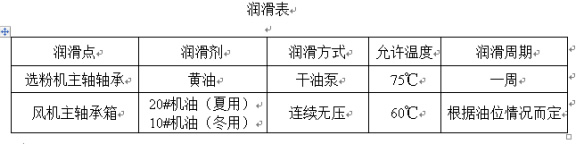 在日常運行中,應保證各潤滑點充分潤滑,并定期對粉分離器內(nèi)軸承和風機軸承進行潤滑(見下表)。在日常維護中,注意粉體分離器轉子的平衡。如發(fā)現(xiàn)異常振動,應立即停機檢查原因,并可在運行前繼續(xù)故障。